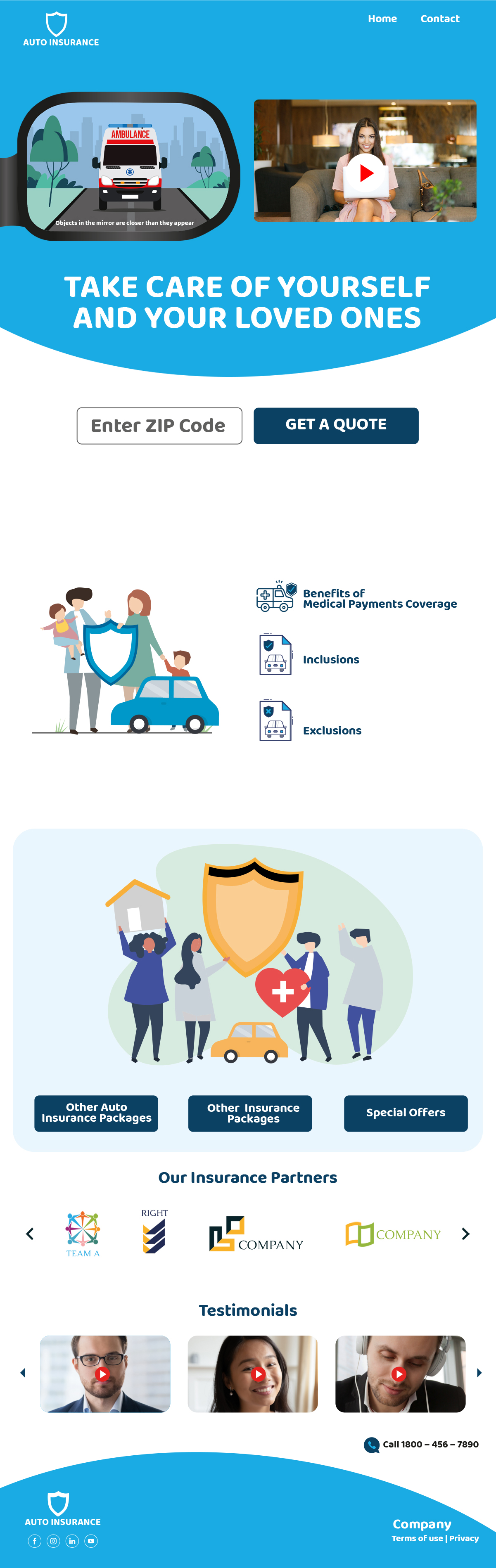 This landing page stresses the need for medical payments coverage to take care of treatment expenses from an accident. Insurance professionals can emphasize how motor insurance only covers the vehicle and not its occupants - urging the end customer to purchase medical coverage.